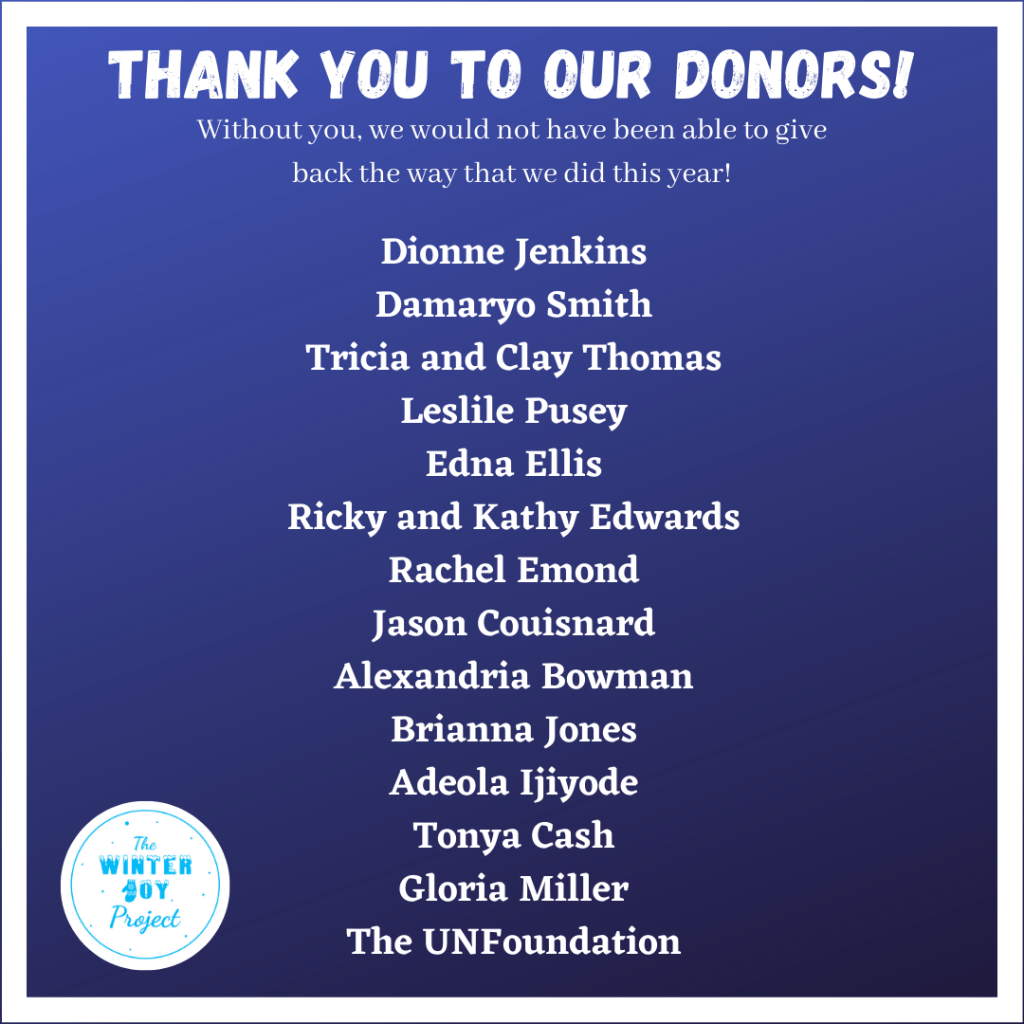 We worked on the development (and expansion) of our goals, vision, and initiatives. We intend to give our winter joy packages to many individuals in many different states. This year was heavily focused on development–how would we implement the new changes that we were committed to making?