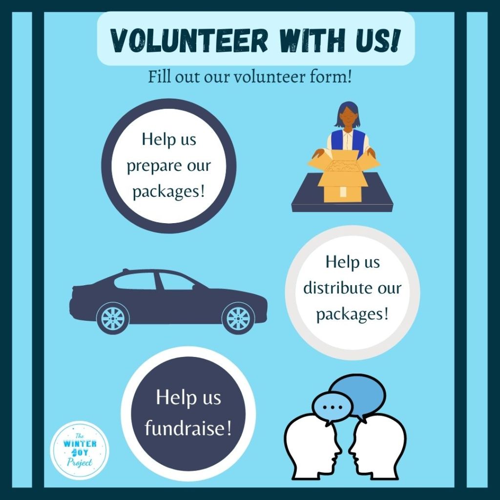 There are three ways for you to volunteer: Packaging, Distribution, and Fundraising!